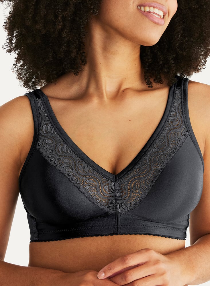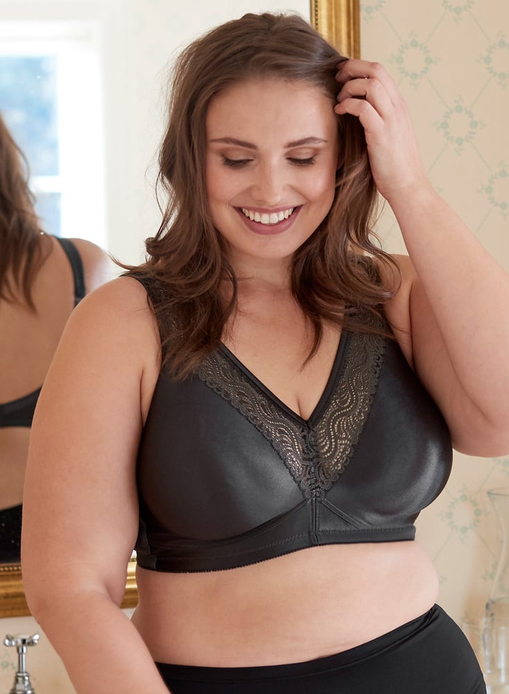 Stable Soft Bra with amazing lift in large sizes too. Wide, strain-relieving straps. Moulded cups for comfort and a smooth silhouette. Lace on the cups for pretty looks. Soft material with a satiny finish to give clothing the best drape.